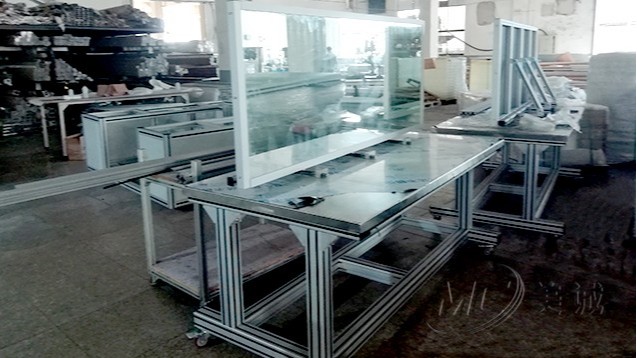 鋁板鏡面工作臺 由鋁型材及鋁型角碼組裝而成,臺面可配防靜電臺面或鋁合金臺面。外形美觀,整體拆裝簡易,結構堅固被廣泛用于車間生產組裝,檢驗、測試等。其常用鋁型材規(guī)格有40*40、40*60、50*50等,也可根據(jù)不同需求選配不同材料制作。